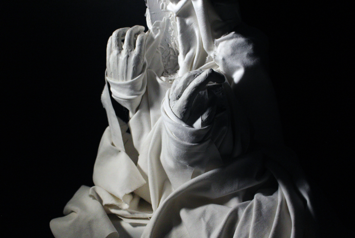 wood and cardboard base, moulding clay, white fabric, acrylic paint, projector, aluminium wire, tin foil